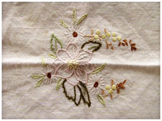 I recently picked up some vintage linen at the local op shop. My idea was to use it as a base for embroidery so I was looking for plain, natural-coloured pieces. I found a few of those, and I even bought some which had flower patterns printed on them, with the idea that I could embellish the print. I also found lots of already embroidered pieces, and of course I couldn't just leave them behind.