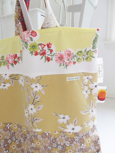 and so it dawned on me, as me and my crafting mojo clung to each other, it had been quite the while since i had made myself a bag. i do like to make a bag for myself to go on my hols. i think i am not alone with wishing something pretty and new to take away in a suitcase. this dawning resulted in me rustling through vintage fabrics and making the biggest possible bag i could without tripping over it. my reason for making such grand scale bags is purely an excuse to deck myself out with the largest quantity of fabby vintage prints i can get away with. then when they are on my shoulder, they just look happy all together in their pretty, slightly odd combination and i cannot help myself from catching their happiness...